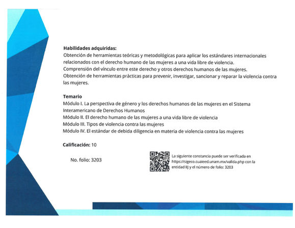 "De parte del Instituto de Investigaciones Jurídicas le felicitamos por haber acreditado satisfactoriamente el programa académico del Diplomado Formación en el Sistema Interamericano de Derechos Humanos “Héctor Fix Zamudio”, 13a. edición
